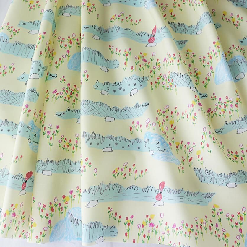 カラフルなお花畑でワニさんが過ごしている、個性あふれるテキスタイルです。