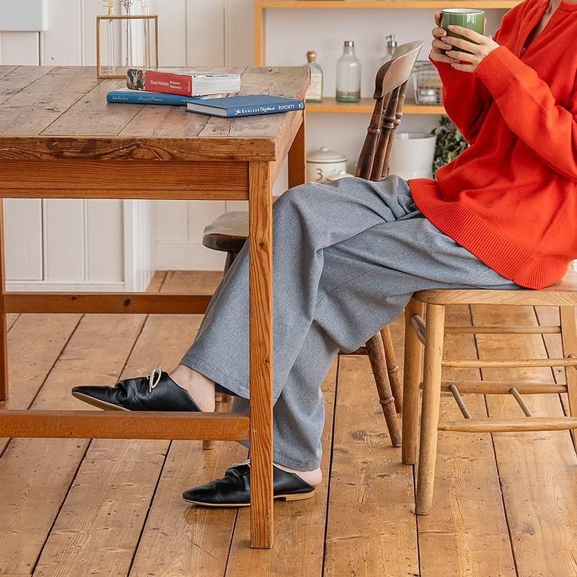 シルエット自体はシンプルなストレートタイプです。トレンドを取り入れたスラックスのような質感なので、普段パンツを履かない方にもおすすめ。