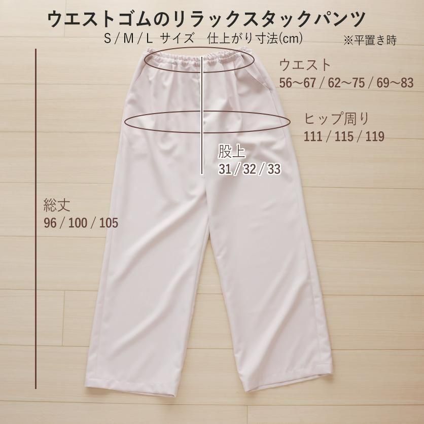 仕上がりサイズ 【S/M/Lサイズ】 cm | [パンツ総丈] 96/100/105 [ウエスト(ゴムで調整)] 56〜67/62〜75/69〜83 [ヒップ周り] 111/115/119 [股上] 31/32/33 |
