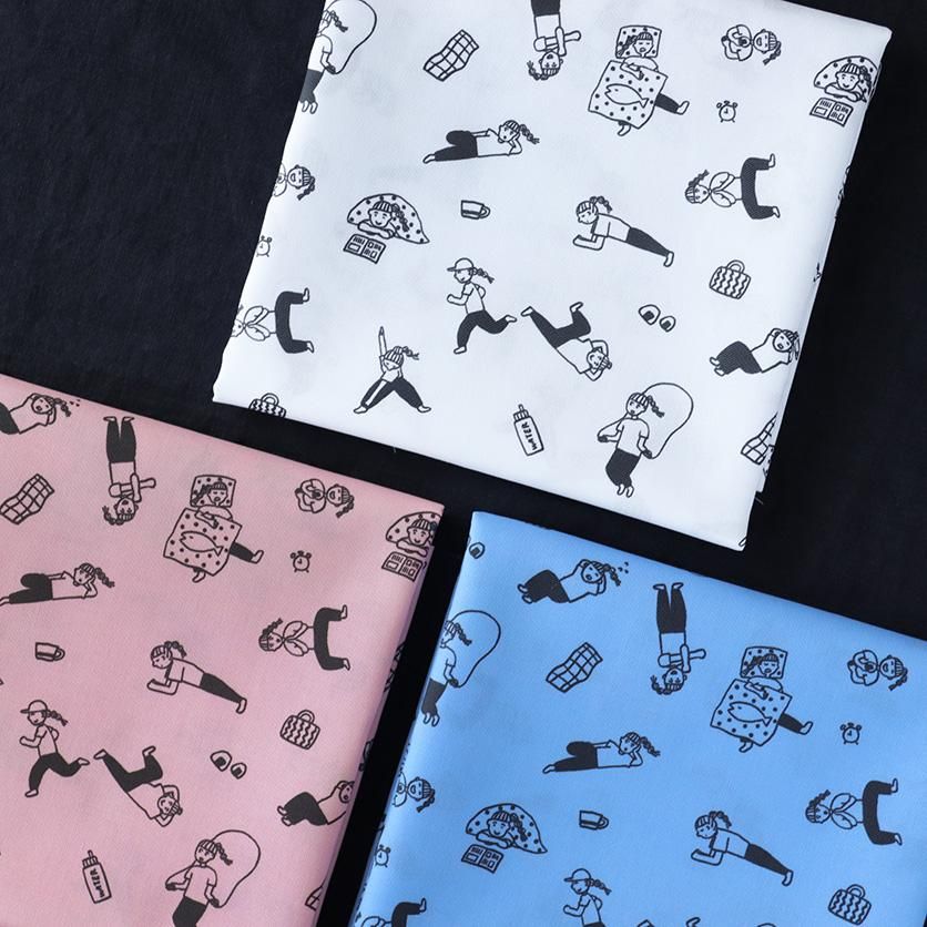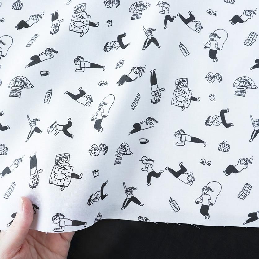 休日に運動をがんばる「わたし」の日常を描いたテキスタイルデザインです。