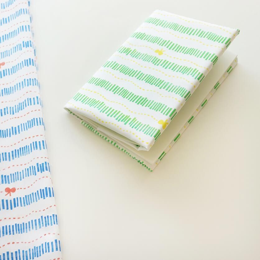・現在、すべてのデザインのプリントに使用している生地は6種類です。素材は100%コットン(オックス)・100%コットン(ダブルガーゼ)・100%コットン(ローン)・コットンリネン(ビエラ織)・100%コットン(ツイル)・100%コットン(キャンバス・11号帆布)です。