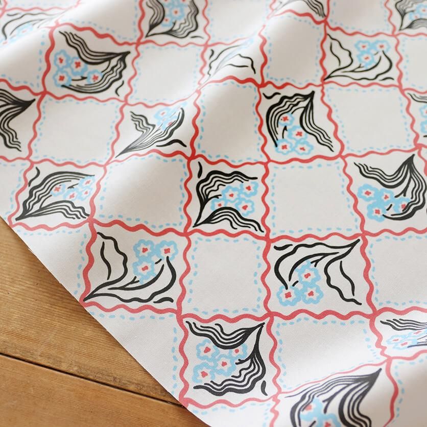 トリコロールのような明るい配色で、小さなブーケとチェックを組み合わせたテキスタイルデザイン。