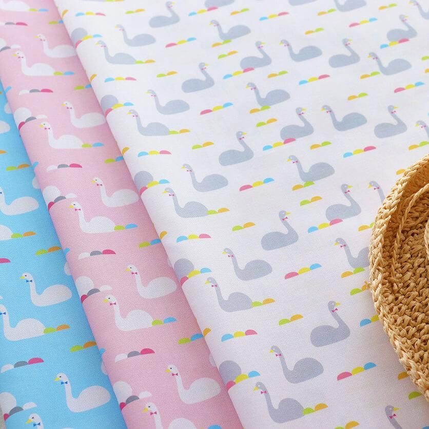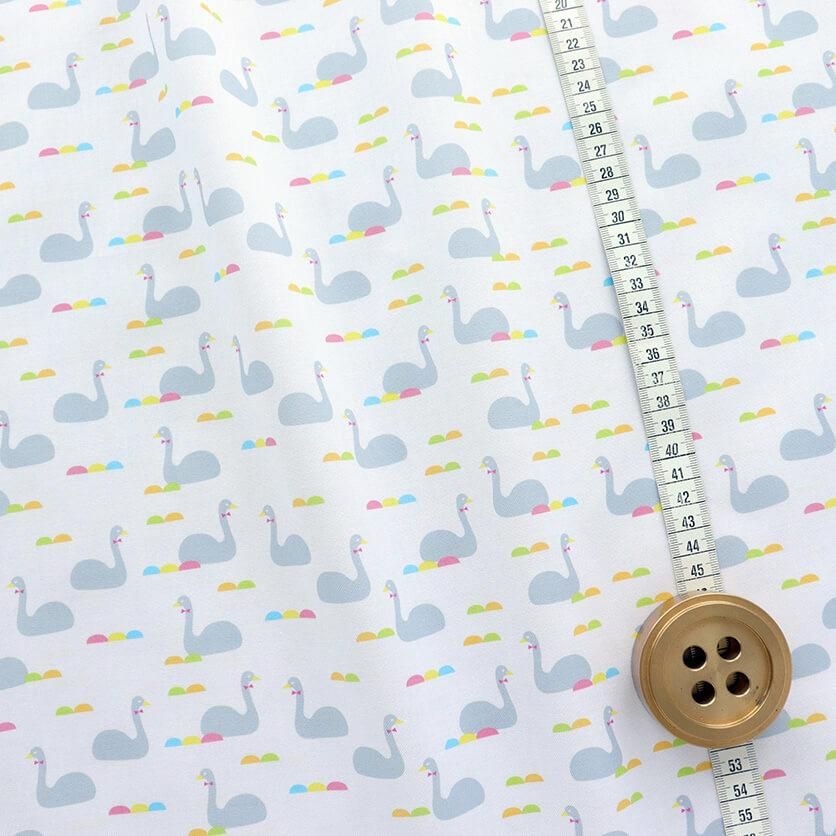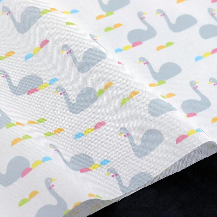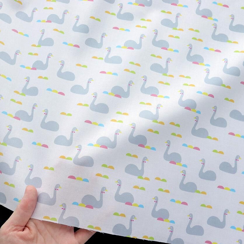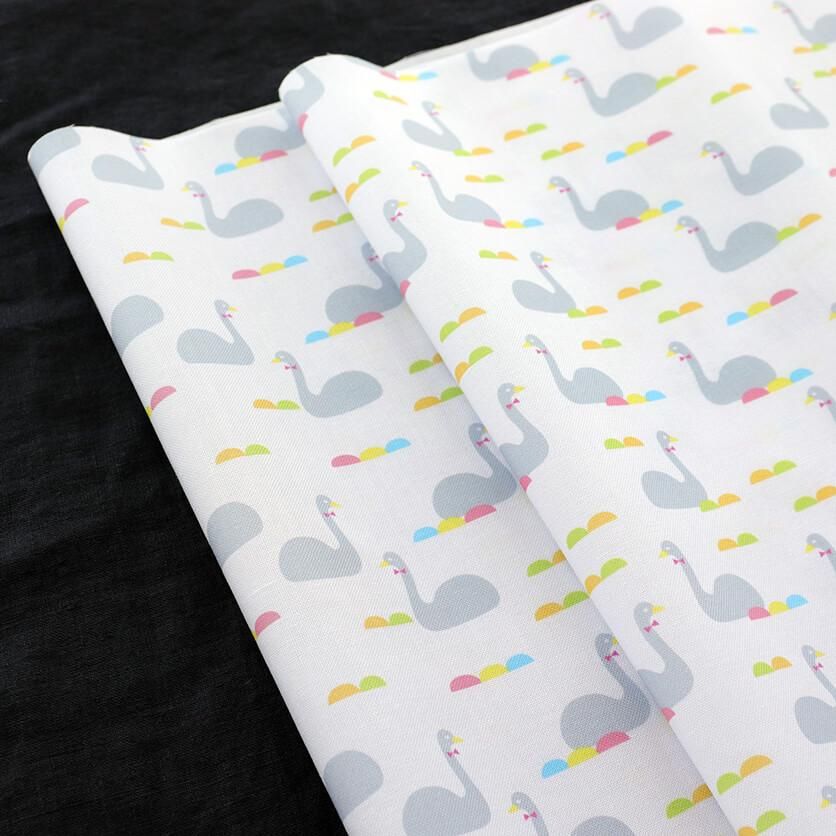 きらきらと光る、澄んだ水の上に、たたずむ白鳥たちがモチーフのテキスタイルデザインです。