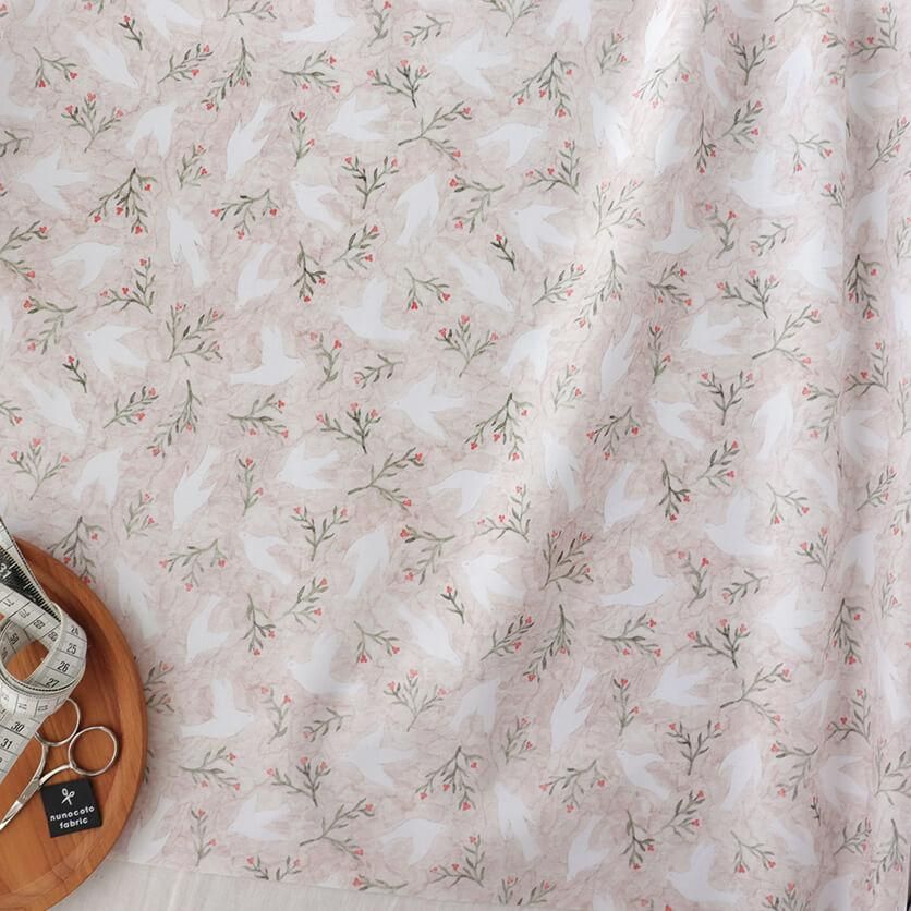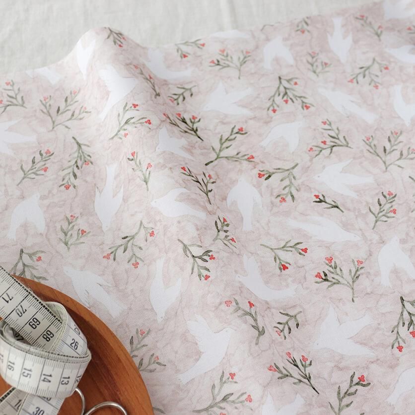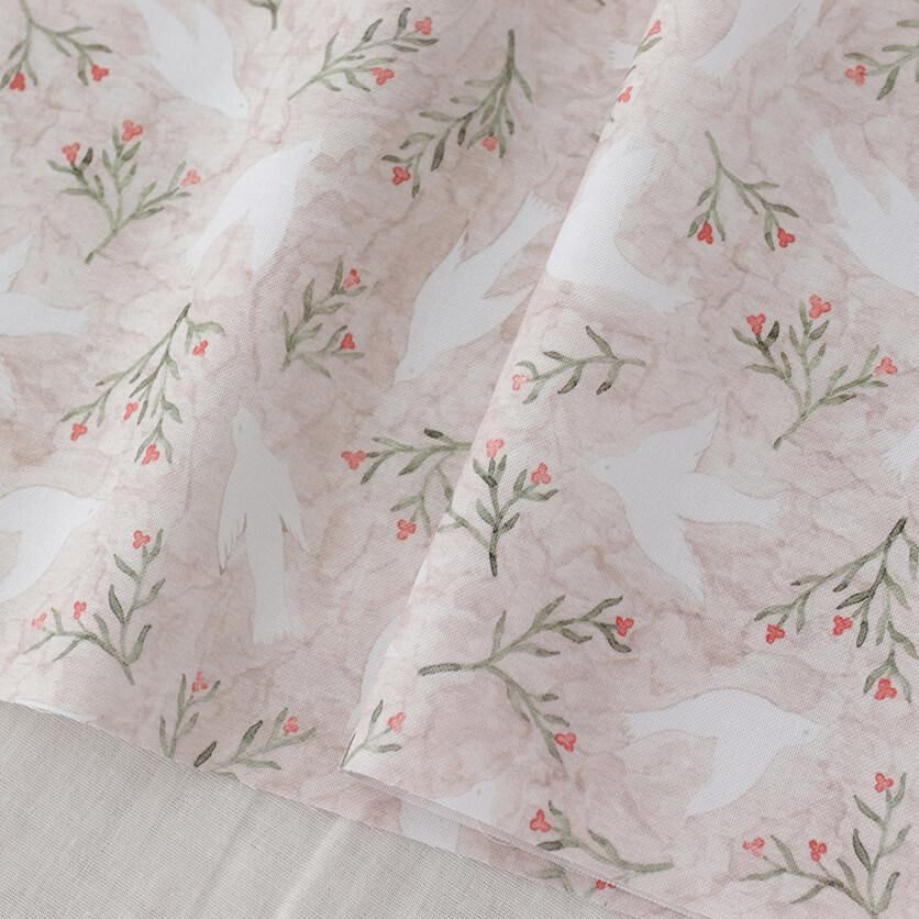 ふわりと舞う白い鳥たちが、幸せを運んでくるようなテキスタイルデザインです。