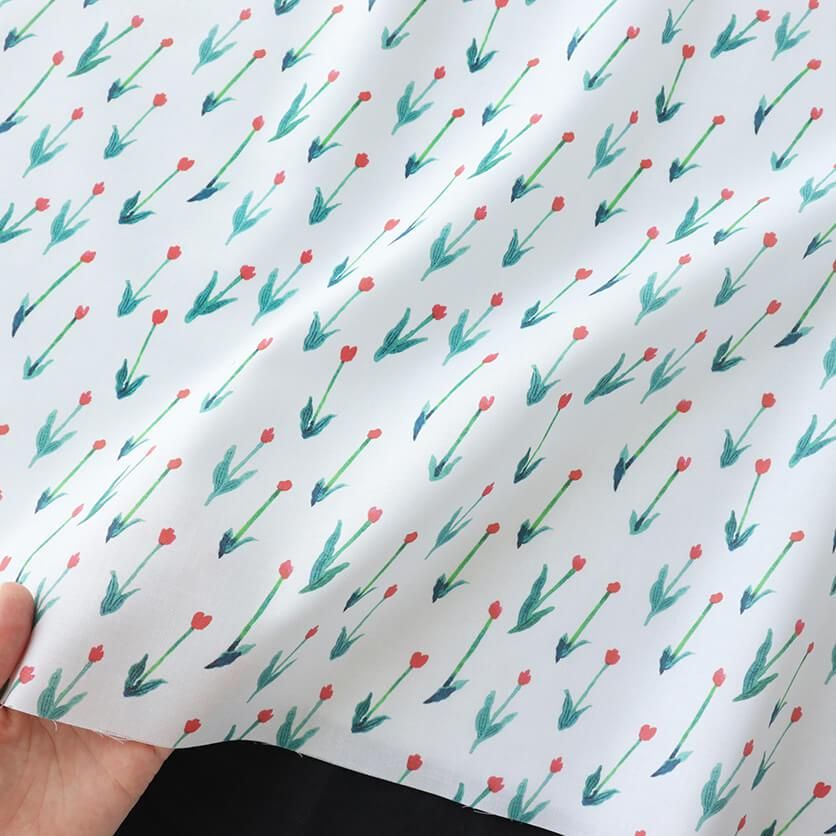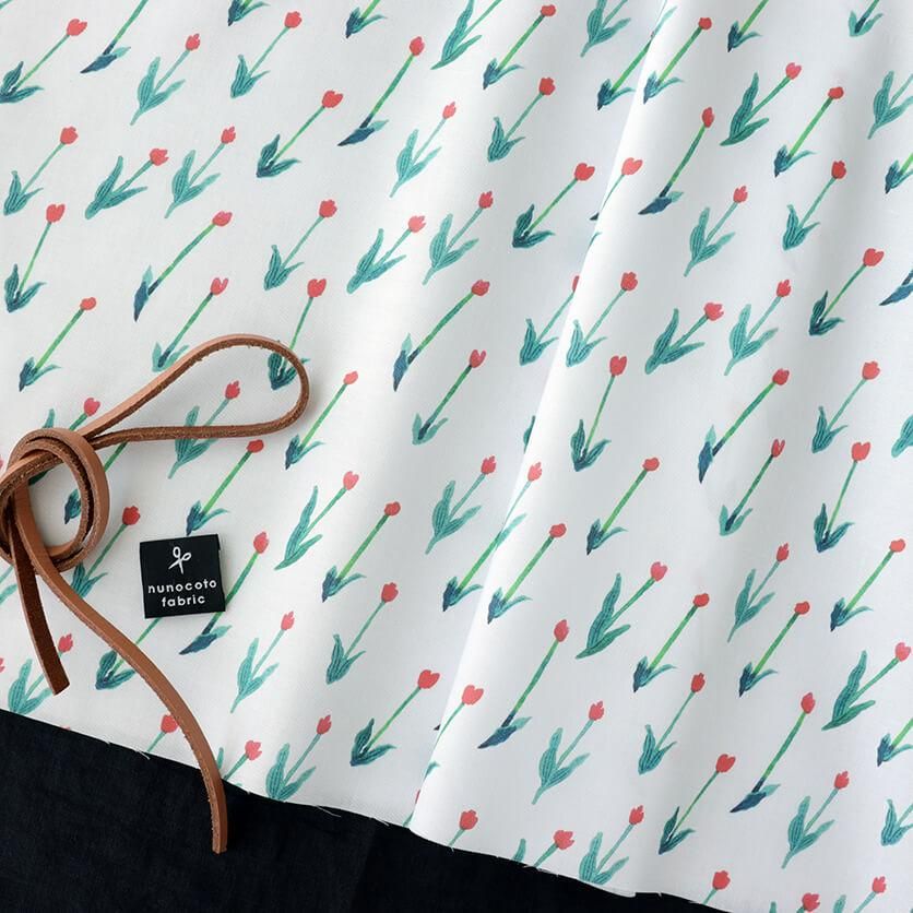 このデザインは、太陽の当たるほうへ、きらきらと向きを変えながら花開くチューリップの姿から生まれました。そんな生命力あふれる一瞬を、リズム感のあるパターンに落とし込んでいます。