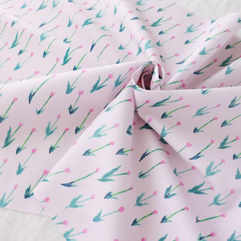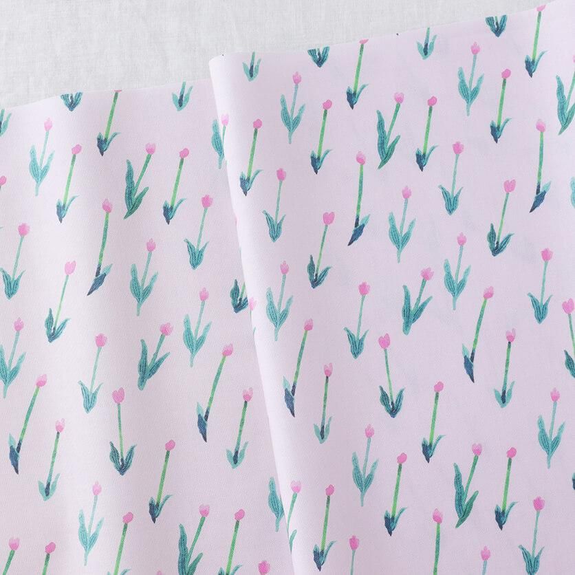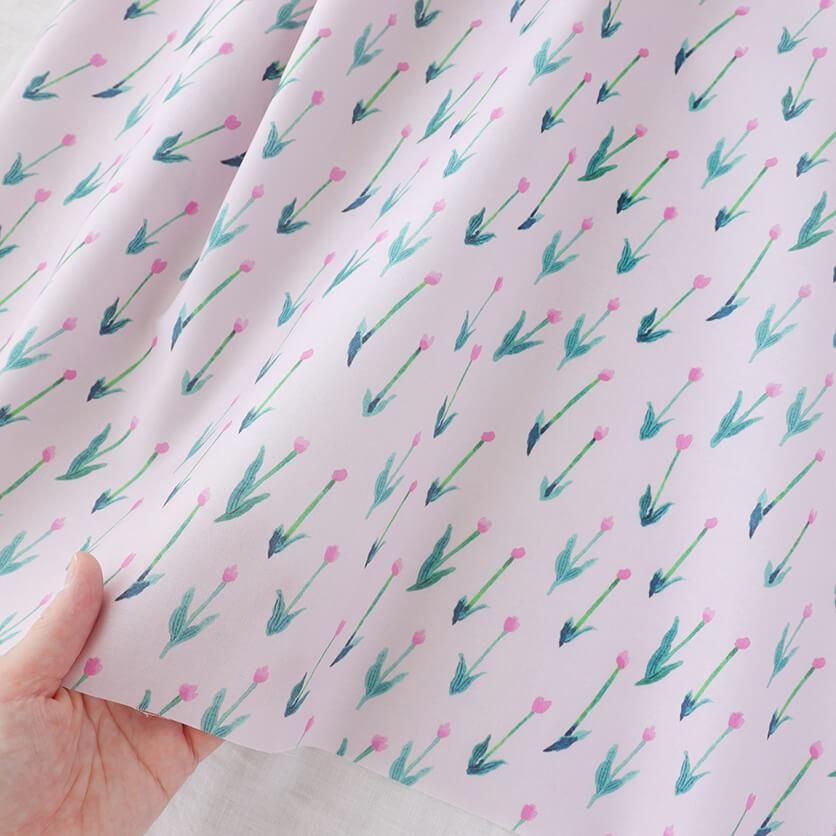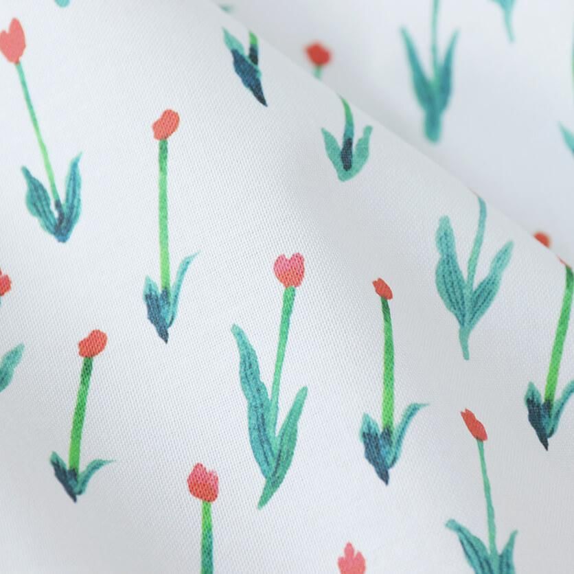 このデザインは、太陽の当たるほうへ、きらきらと向きを変えながら花開くチューリップの姿から生まれました。そんな生命力あふれる一瞬を、リズム感のあるパターンに落とし込んでいます。