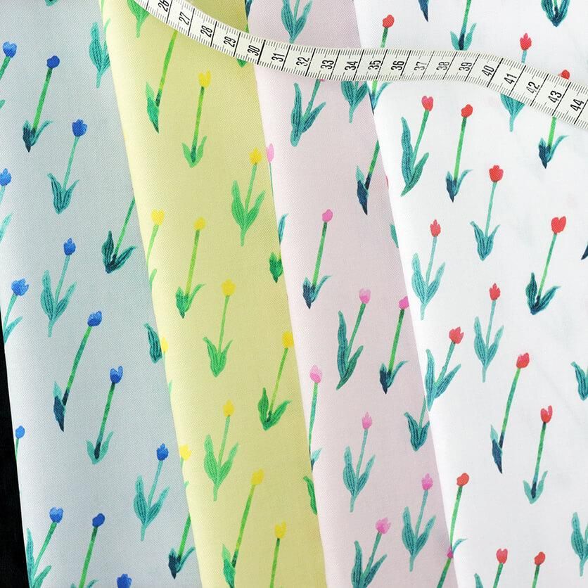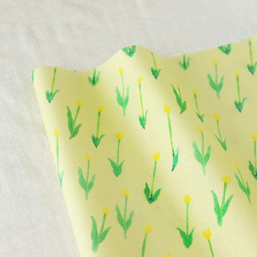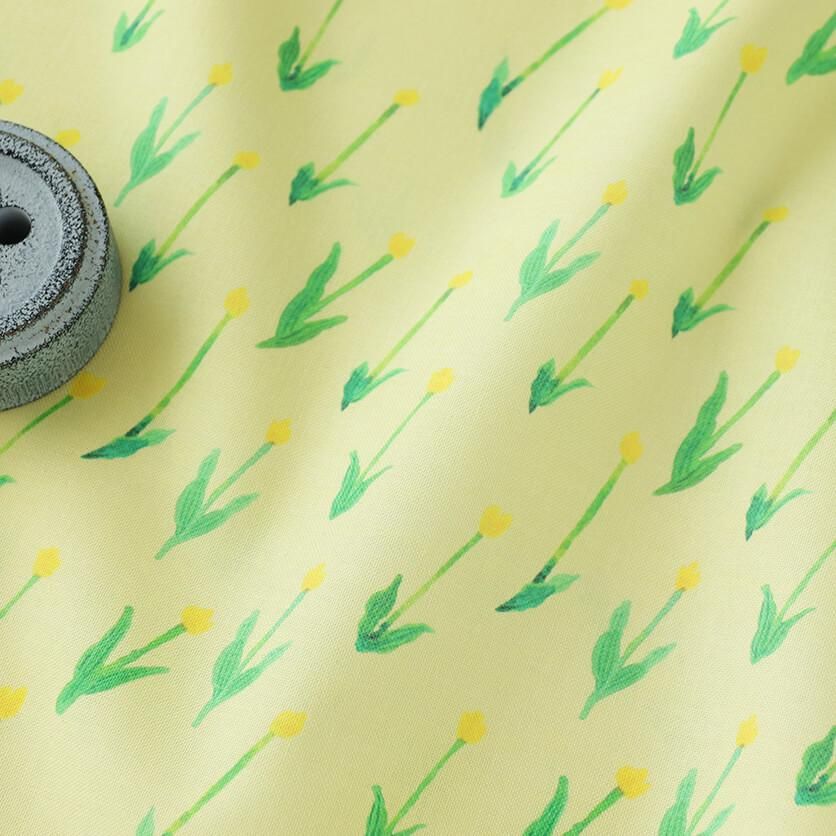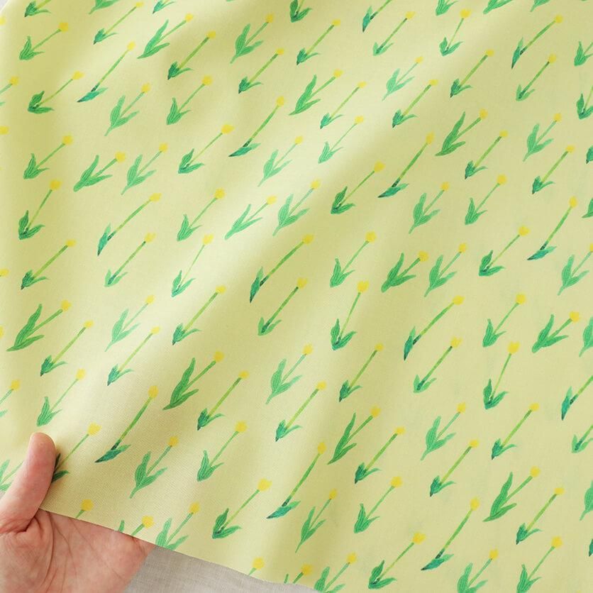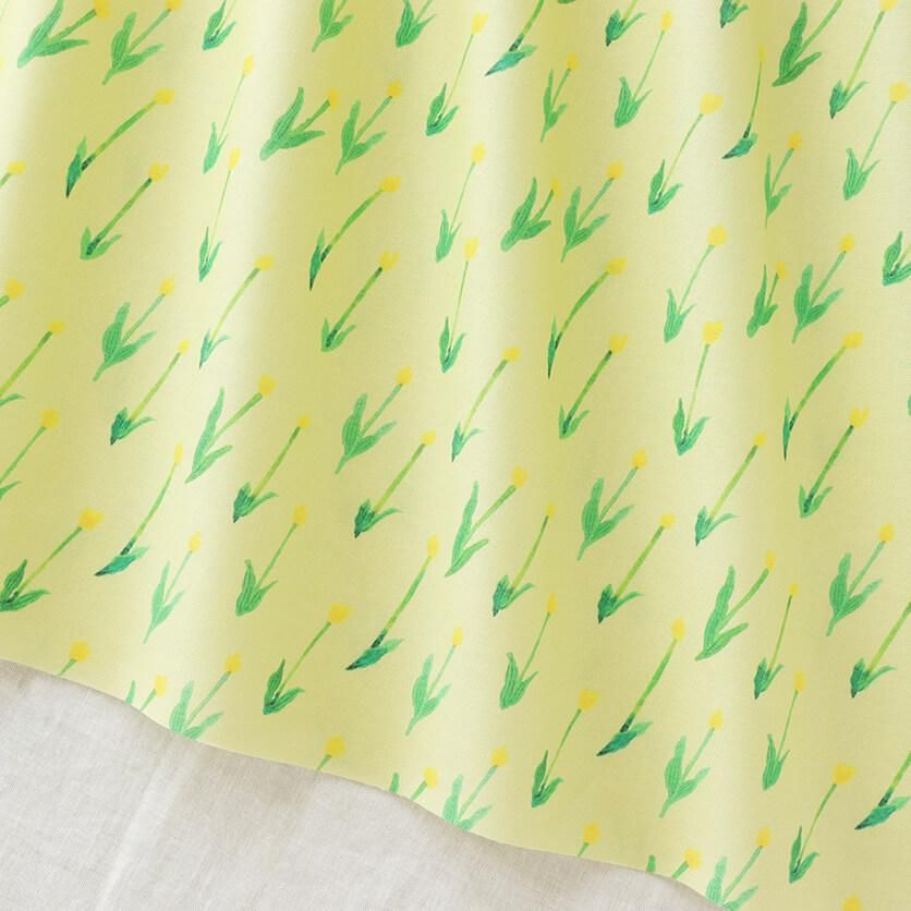 このデザインは、太陽の当たるほうへ、きらきらと向きを変えながら花開くチューリップの姿から生まれました。そんな生命力あふれる一瞬を、リズム感のあるパターンに落とし込んでいます。