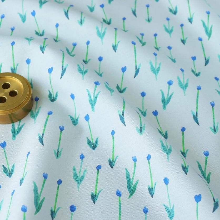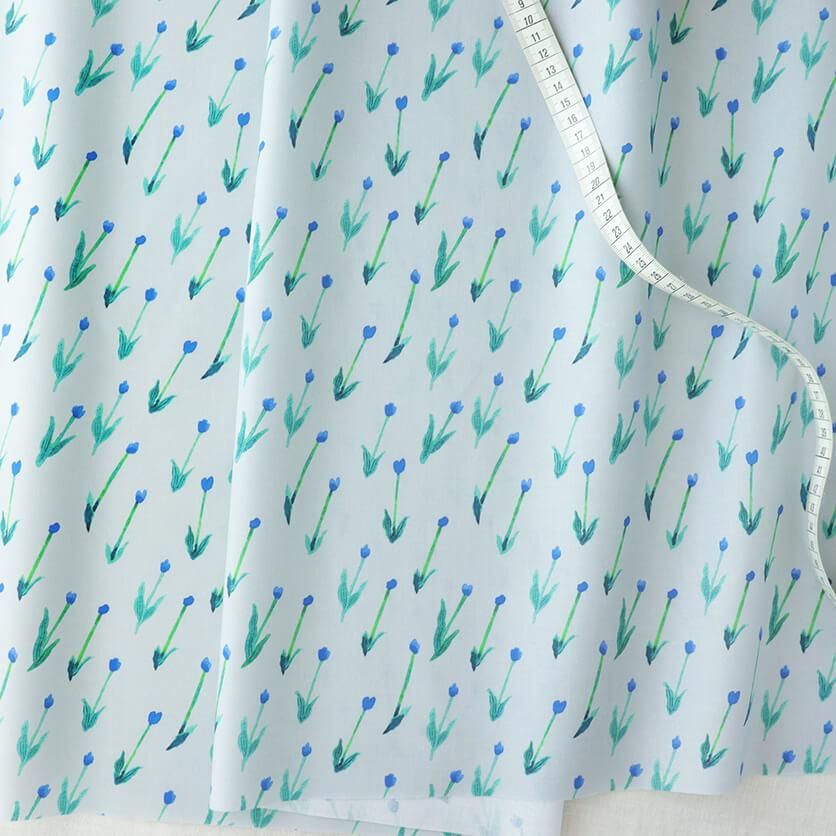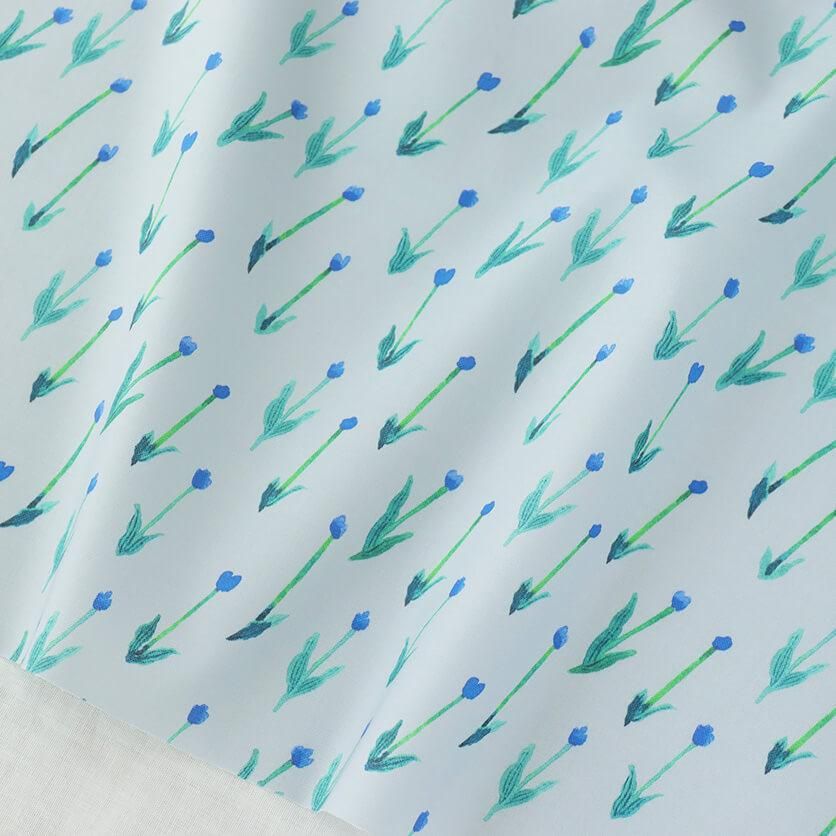 このデザインは、太陽の当たるほうへ、きらきらと向きを変えながら花開くチューリップの姿から生まれました。そんな生命力あふれる一瞬を、リズム感のあるパターンに落とし込んでいます。