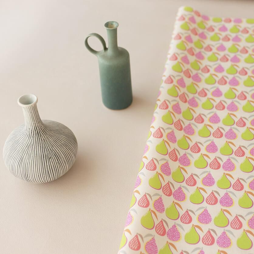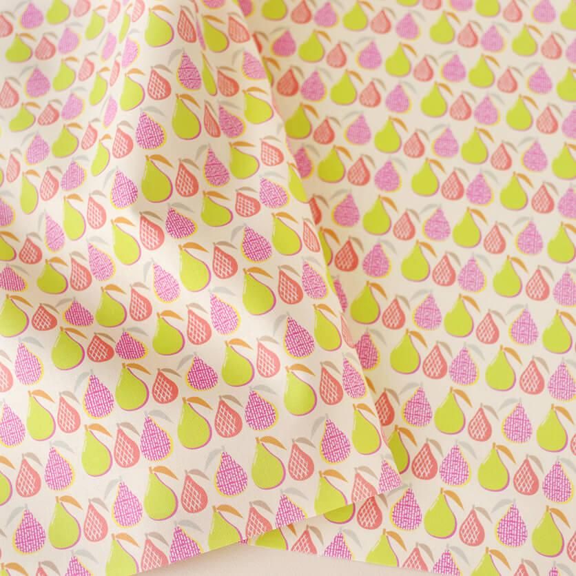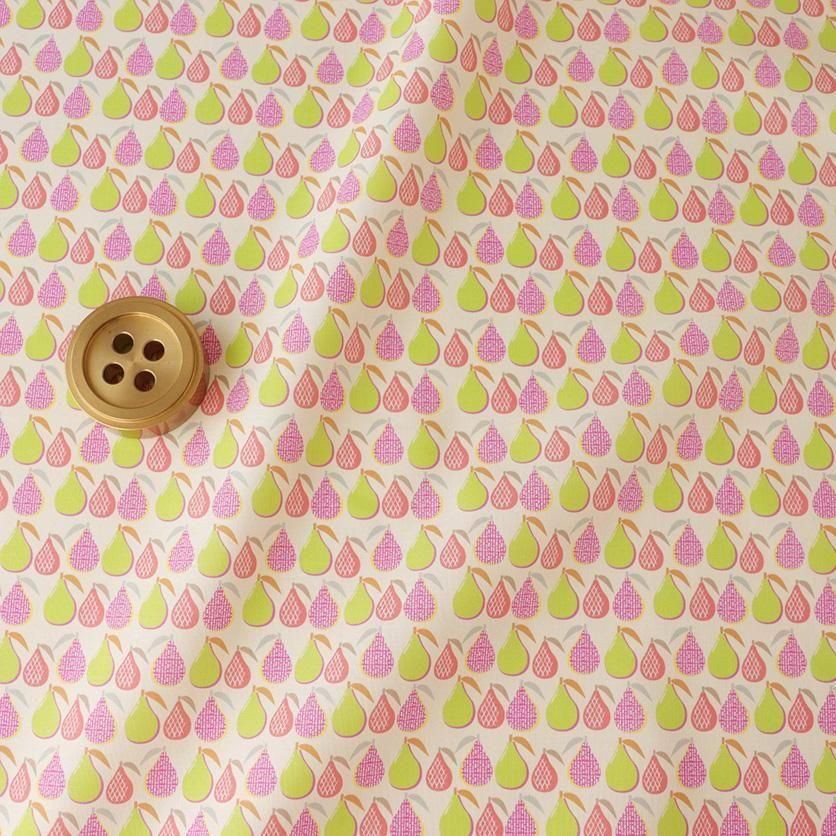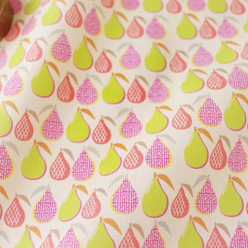 コロコロと愛らしい、独特な瓶のような形の洋梨を一面に散りばめた、心温まるテキスタイルデザインです。