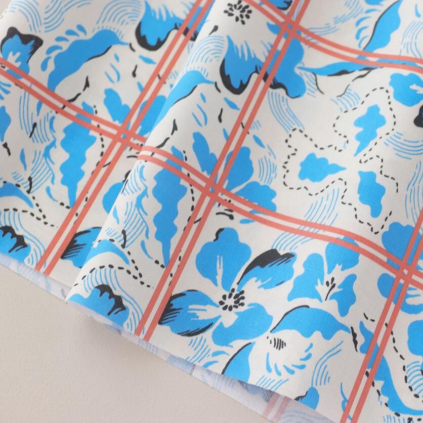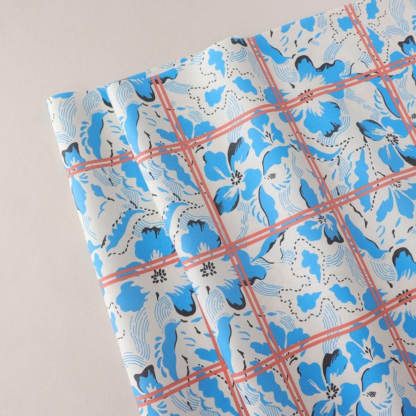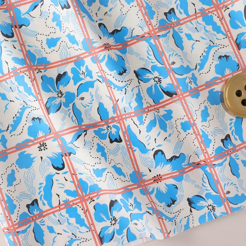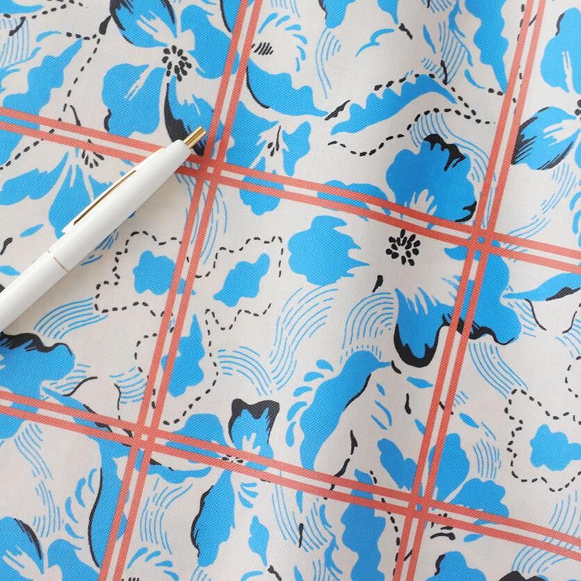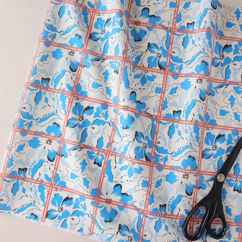 大胆に描かれたブルーのお花の上を、温かみのあるピンク色のラインが格子状に駆け巡ります。
