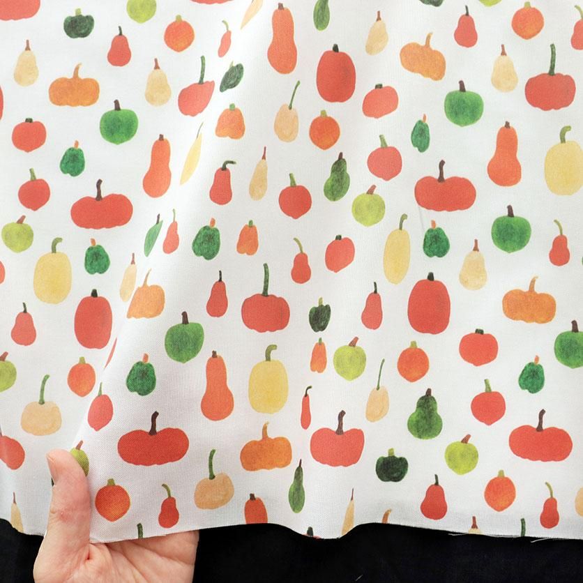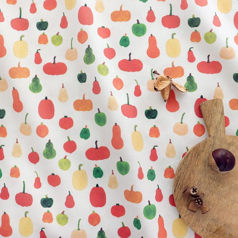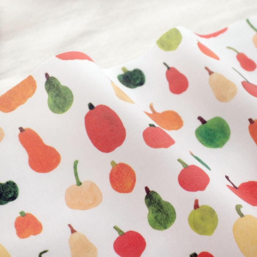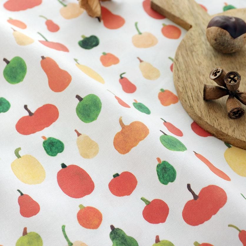 ころり、とろん。様々なかたちのかぼちゃがリズミカルに踊るこの模様は、見る人の心に豊かな物語を紡ぎます。日本の穏やかな秋の風景から着想を得て、落ち着きのある「和」の色彩で描かれました。