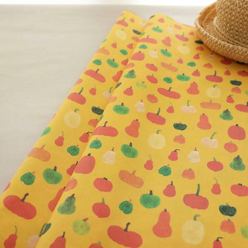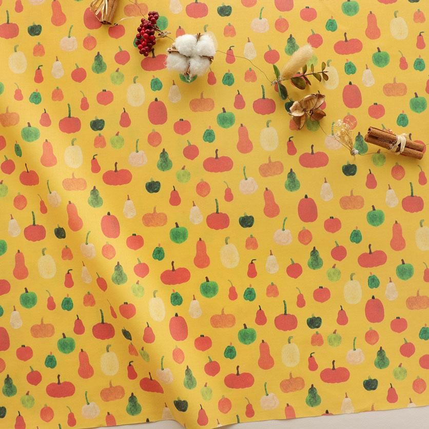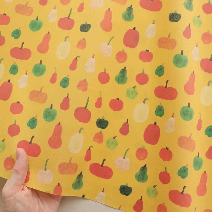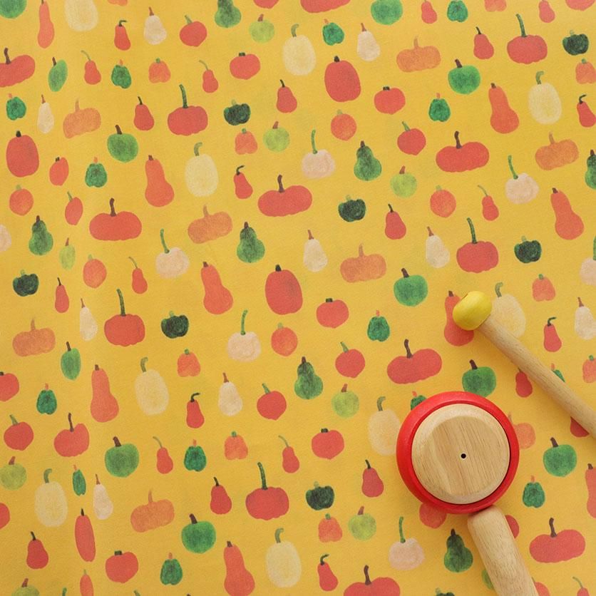 ころり、とろん。様々なかたちのかぼちゃがリズミカルに踊るこの模様は、見る人の心に豊かな物語を紡ぎます。日本の穏やかな秋の風景から着想を得て、落ち着きのある「和」の色彩で描かれました。