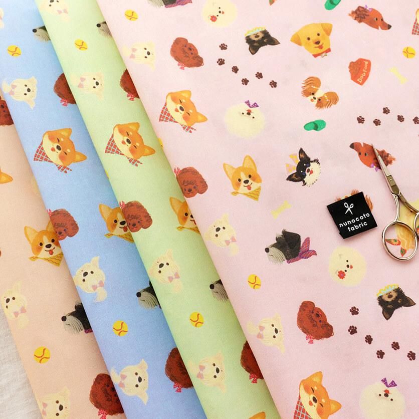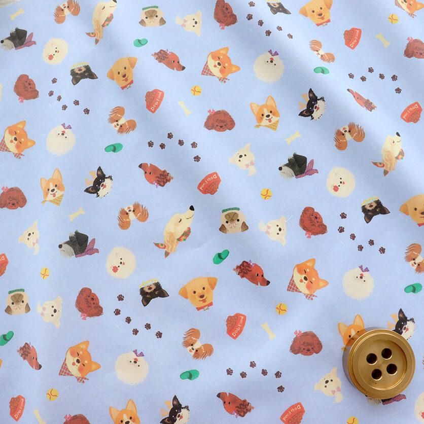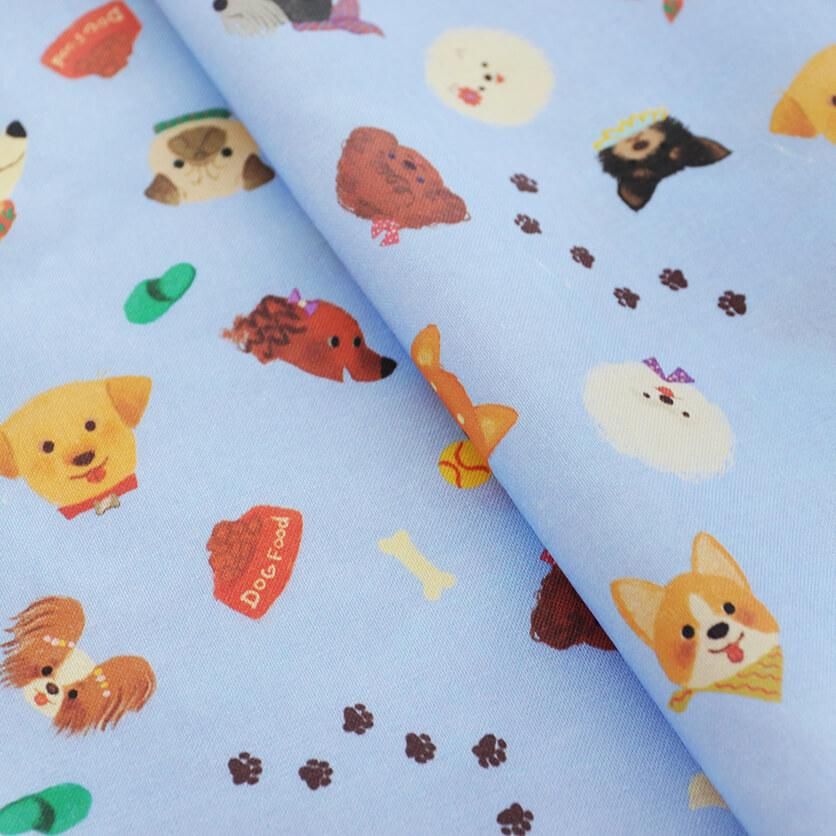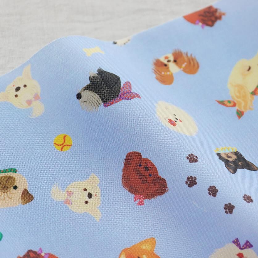 飼い主さんに可愛くおめかししてもらった、チャーミングな表情がずらりと並んだテキスタイルです。