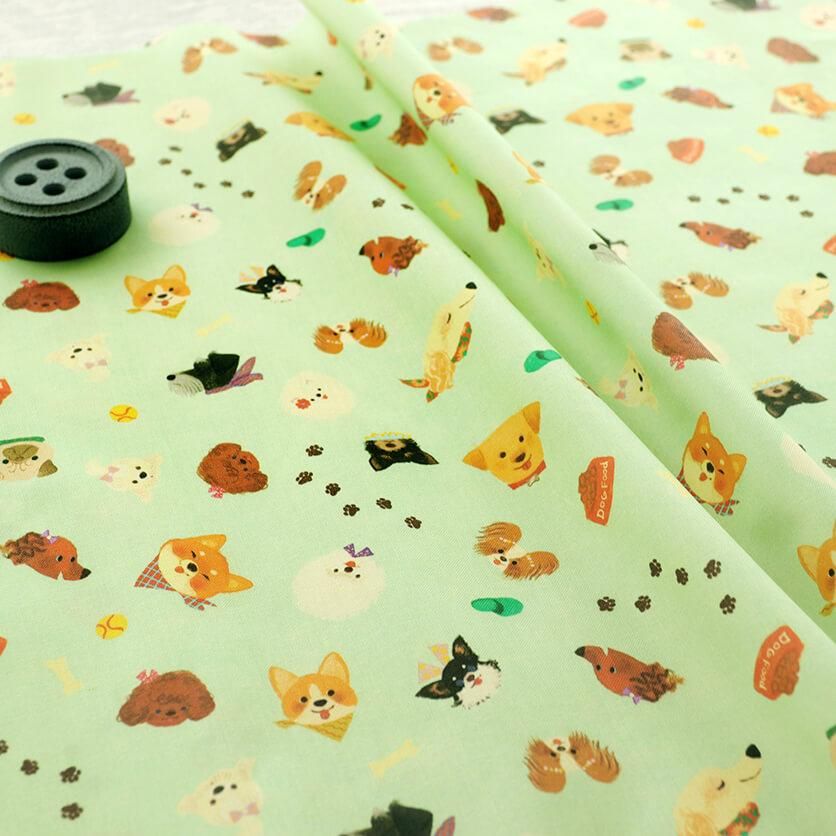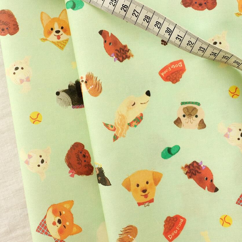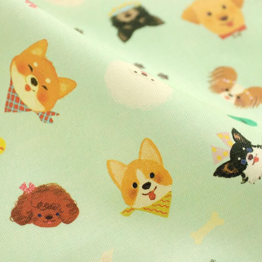 飼い主さんに可愛くおめかししてもらった、チャーミングな表情がずらりと並んだテキスタイルです。
