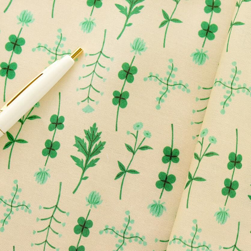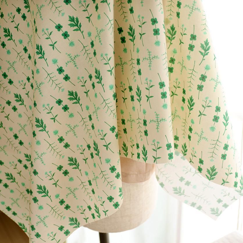 陽だまりのような優しいクリーム色の生地の上で、みずみずしいグリーンがリズミカルに踊ります。まるで小さな野原を散歩しているような、穏やかで優しい気持ちにさせてくれる一枚。