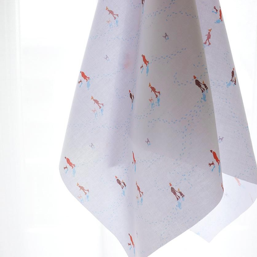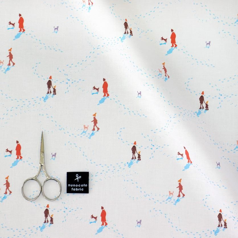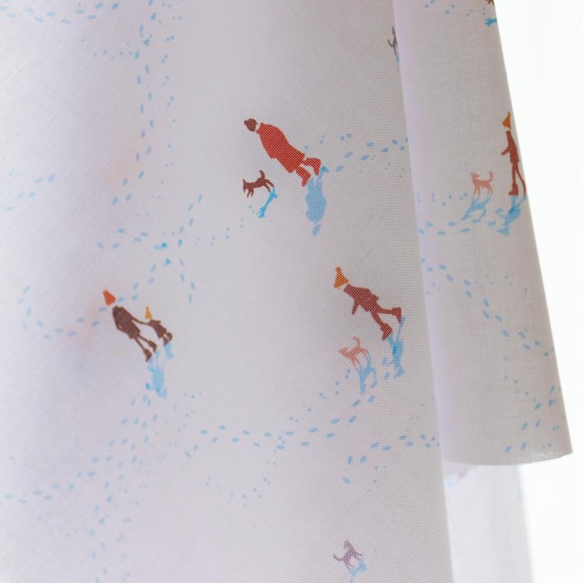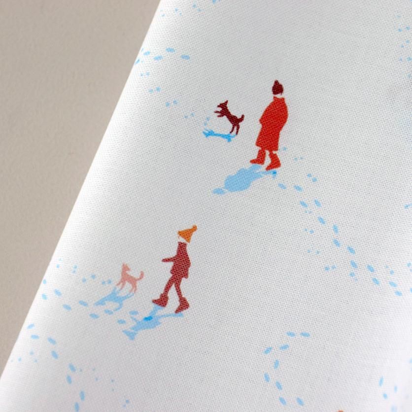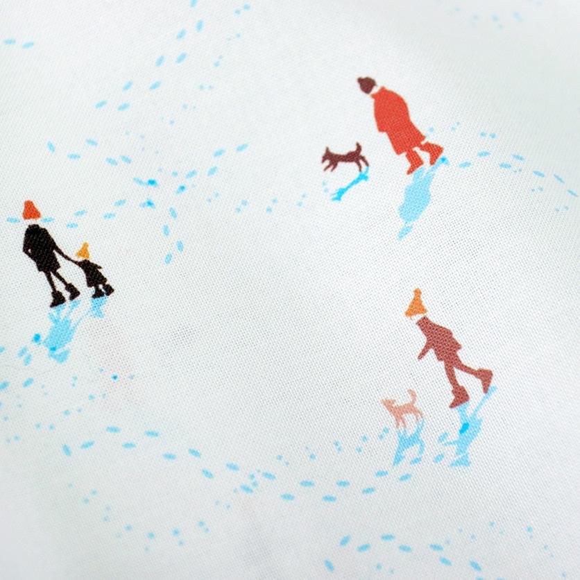 冬の散歩を楽しむ人々と、愛らしい犬たち。雪景色の中に佇む小さなモチーフに、思わず心が温まる、そんなテキスタイルデザインです。