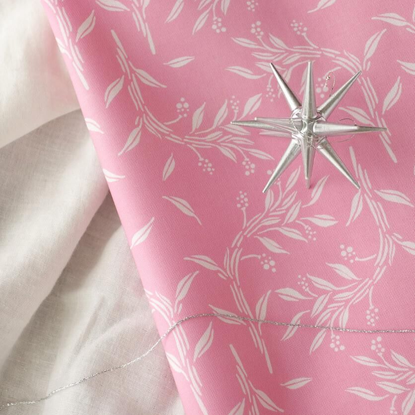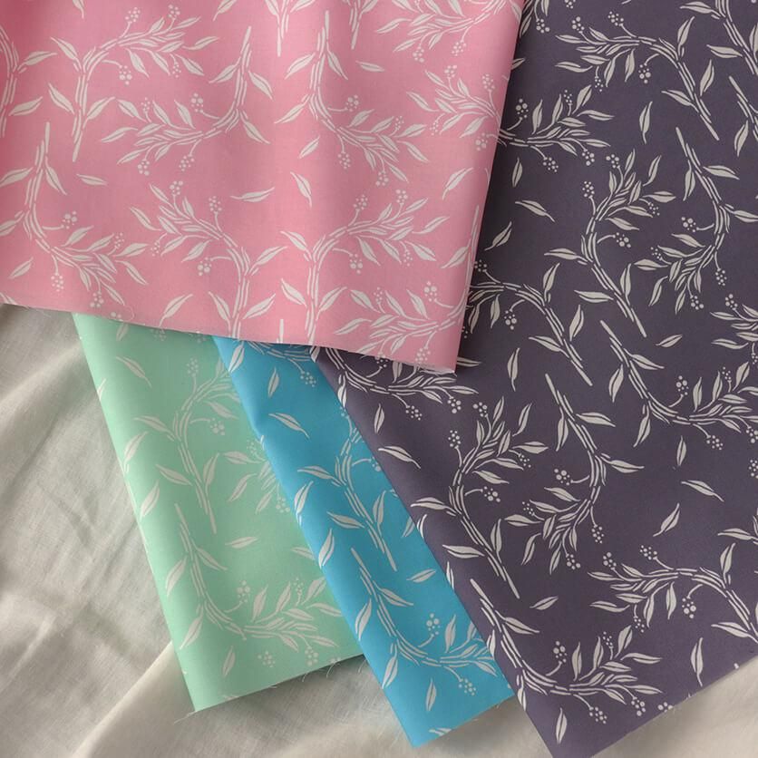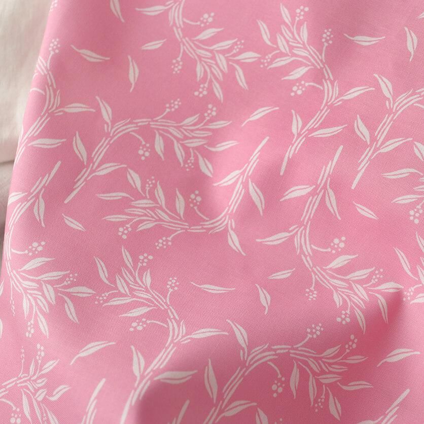 シンプルな配色と、繊細に描かれた小枝と小さな実のモチーフのコントラストが、お洋服作りにぴったりの生地です。