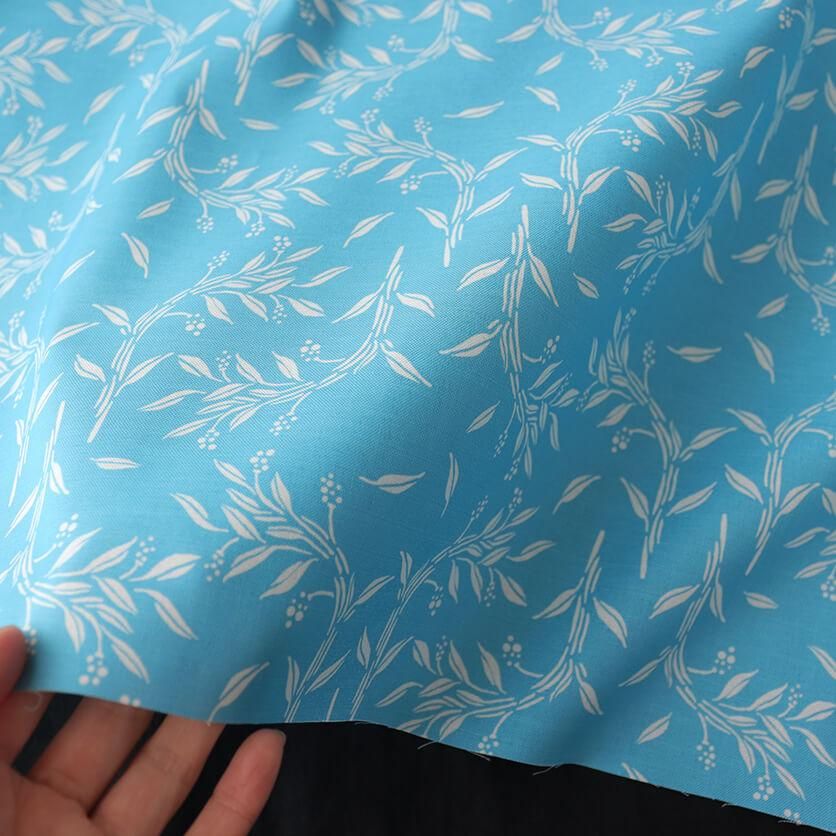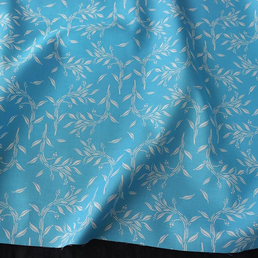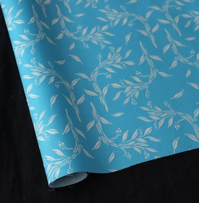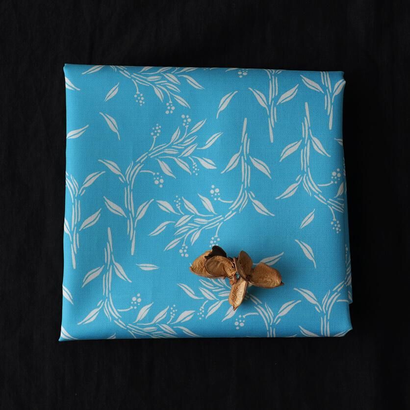 シンプルな配色と、繊細に描かれた小枝と小さな実のモチーフのコントラストが、お洋服作りにぴったりの生地です。