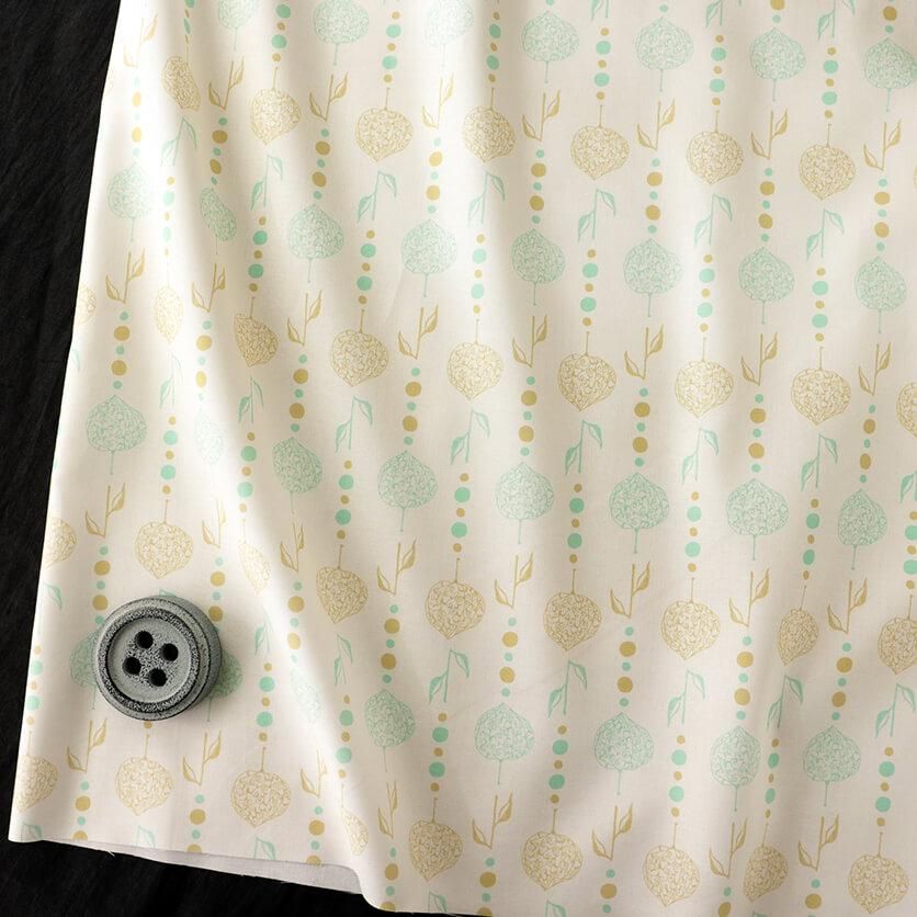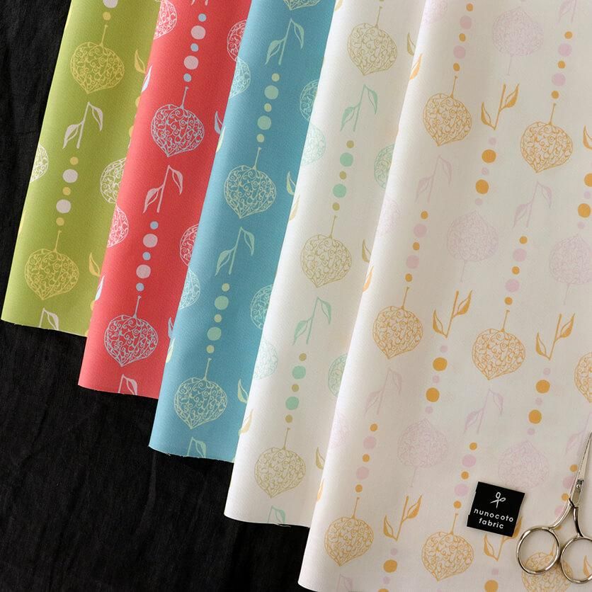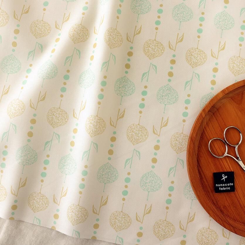 繊細な透かしボオズキを、ビーズカーテンのようにつなげたモチーフがユニークなテキスタイルデザインです。和と異国の雰囲気が静かに溶け合うエキゾチックな模様が印象的。