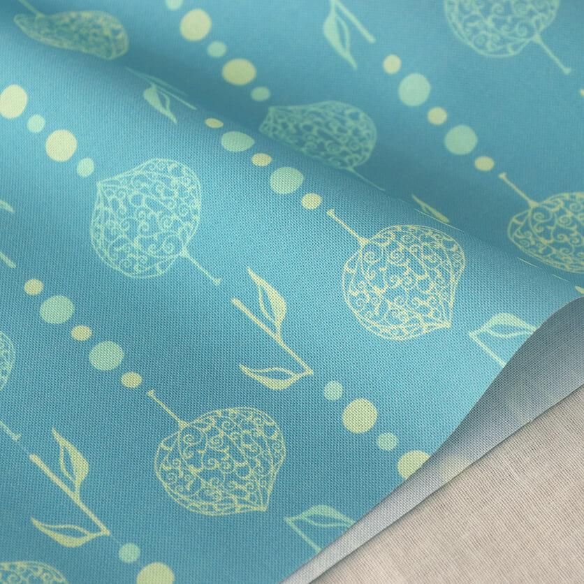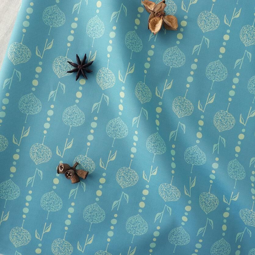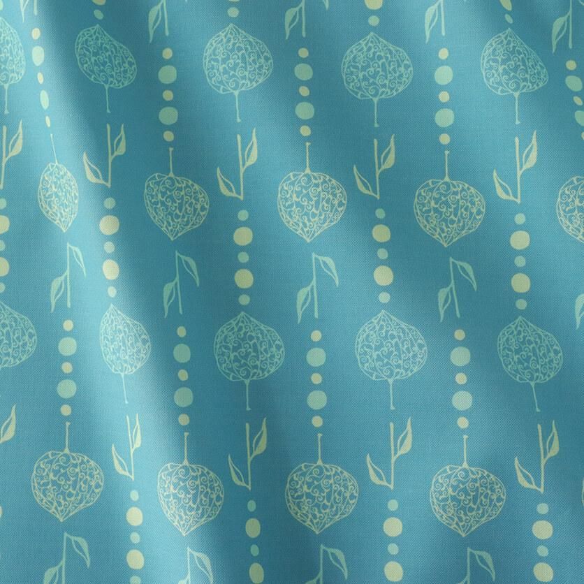 繊細な透かしボオズキを、ビーズカーテンのようにつなげたモチーフがユニークなテキスタイルデザインです。和と異国の雰囲気が静かに溶け合うエキゾチックな模様が印象的。