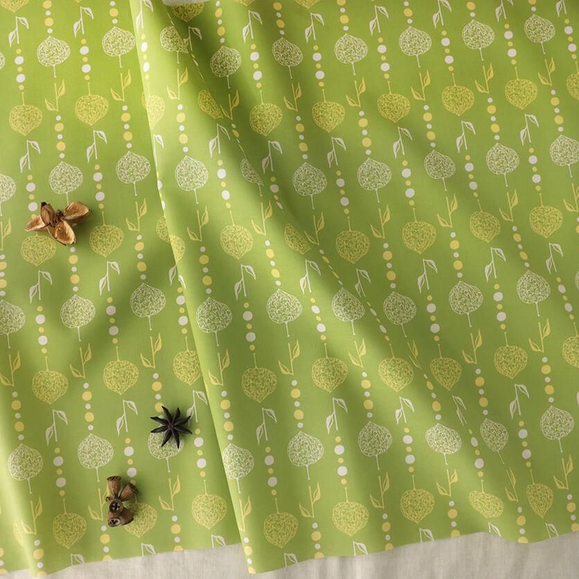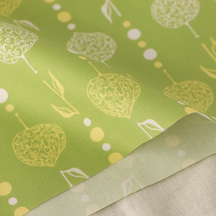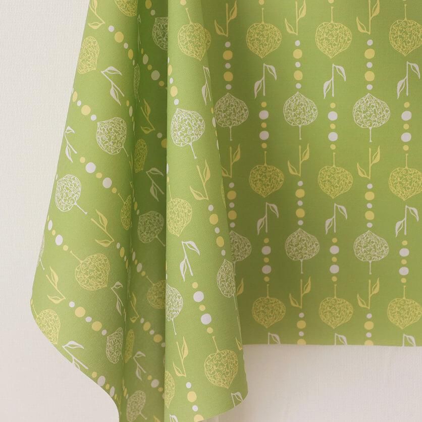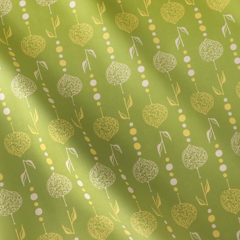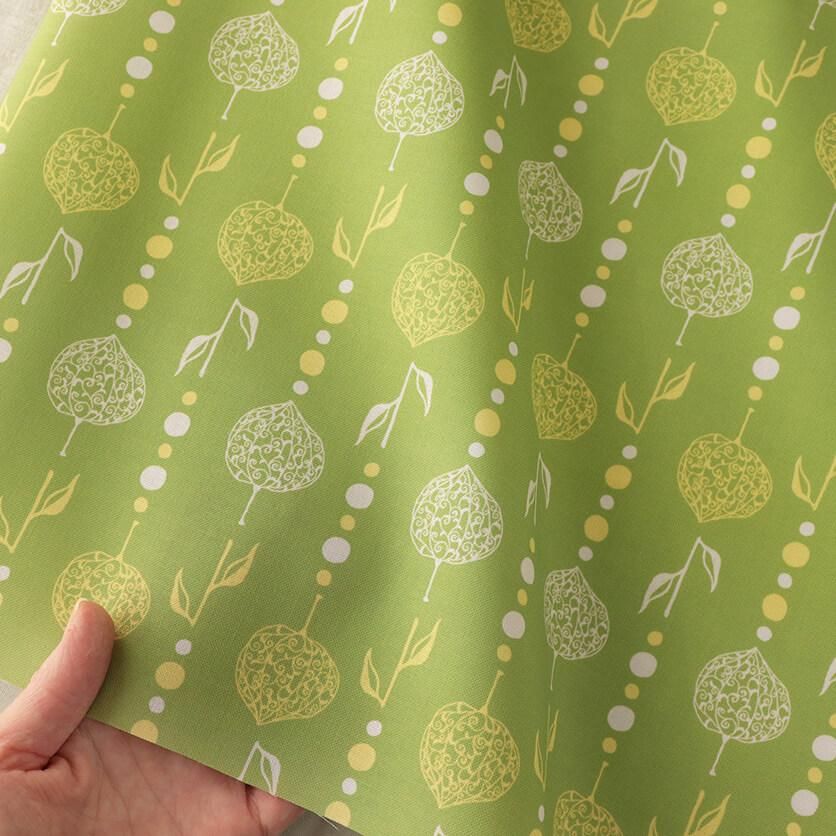 繊細な透かしボオズキを、ビーズカーテンのようにつなげたモチーフがユニークなテキスタイルデザインです。和と異国の雰囲気が静かに溶け合うエキゾチックな模様が印象的。