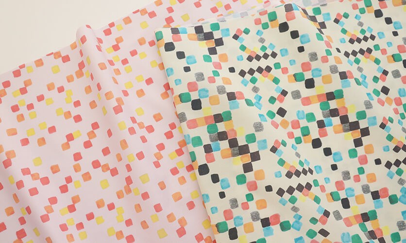 天気のいい午後に、ノートの小さなマス目を新しいペンで塗る楽しさから生まれた、遊び心あふれるテキスタイルです。