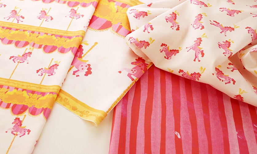 繊細な装飾とくるくる回る木馬たちが可愛らしいテキスタイルデザインです。