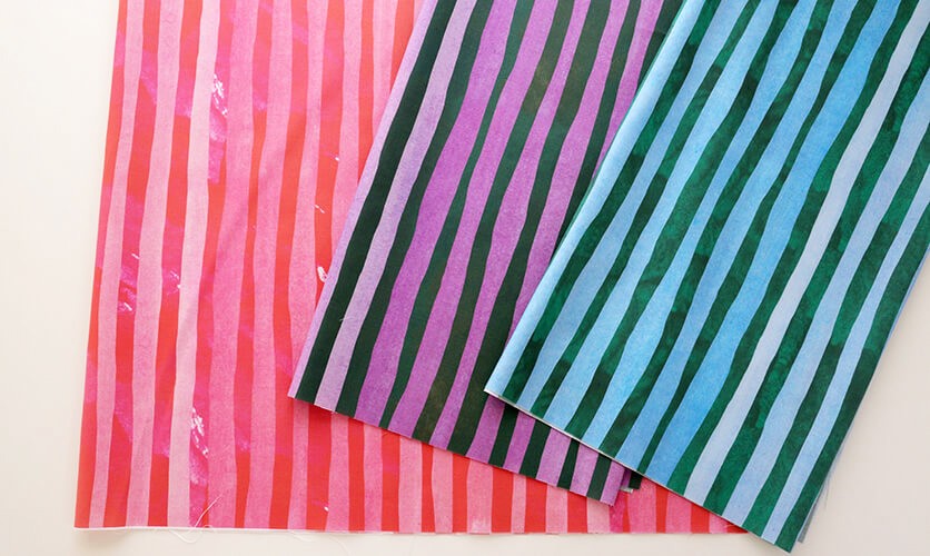 そんなメリーゴーランドをベースとして、模様パーツを分解し、新しいテキスタイルデザインとして展開したのがこちらの「コラージュ・ストライプ」です。