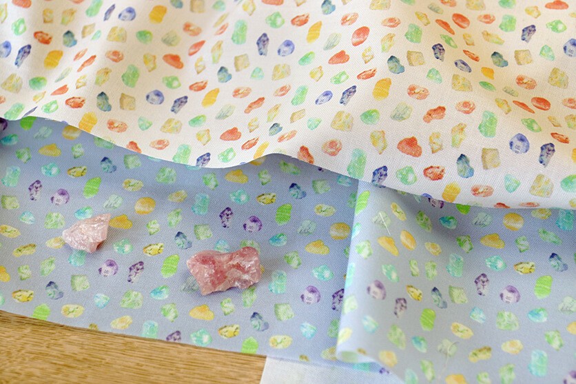 キラキラと輝く「自分だけの宝物」を見つけた時の感動を、そのまま生地に閉じ込めました。大人も子供も夢中になって楽しんだ宝石探しの思い出から生まれたデザインには、つやつやとしたキャンディーのような石や、傷さえも魅力に変えて光り輝く石など、色とりどりの個性豊かな石たちがぎゅっと並んでいます。