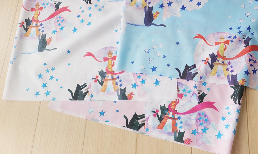 幻想的なグラデーションと星が舞うドラマチックな柄は、お子様の通園バッグやパジャマに仕立てれば、夢の中でも黒猫と一緒に冒険を楽しめそう。大人の方なら、シンプルなトートバッグやポーチのアクセントにして、遊び心をプラスするのも素敵です。物語を身にまとうような、特別な一着や小物作りにいかがでしょうか。