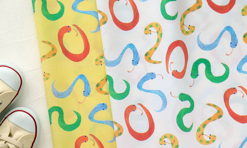 切り貼りコラージュから生まれた、にょろにょろと楽しげに動き回るへびのテキスタイルデザインです。