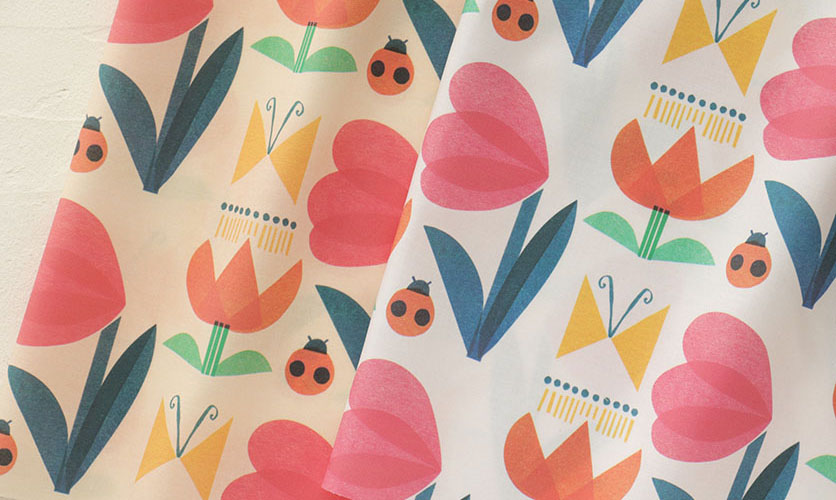 ・現在、すべてのデザインのプリントに使用している生地は6種類です。素材は100%コットン(オックス)・100%コットン(ダブルガーゼ)・100%コットン(ローン)・コットンリネン(ビエラ織)・100%コットン(ツイル)・100%コットン(キャンバス・11号帆布)です。