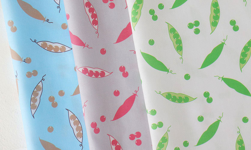 暮らしに馴染み深いお野菜が、リズム感よく生地の上で踊る様子は、見るだけで気持ちを明るく弾ませてくれます。