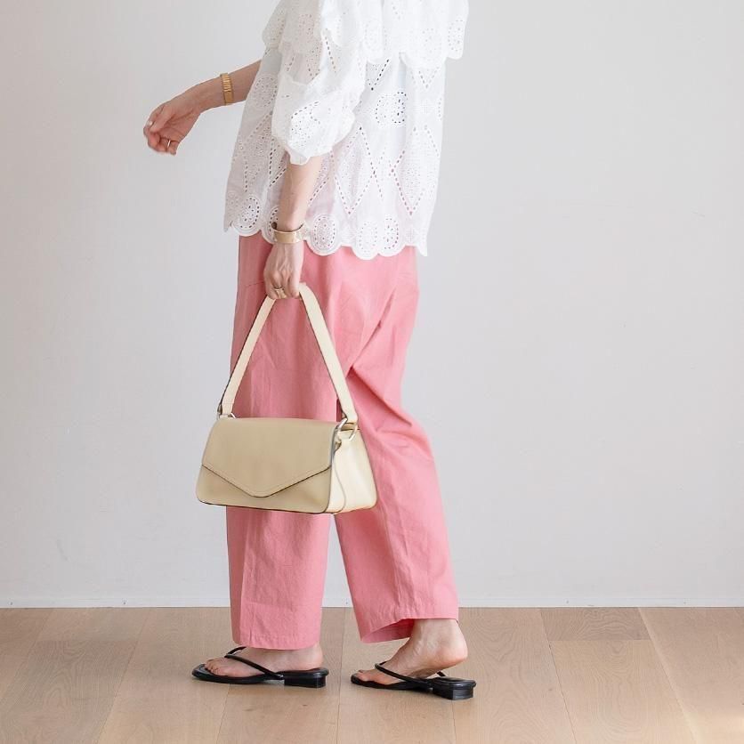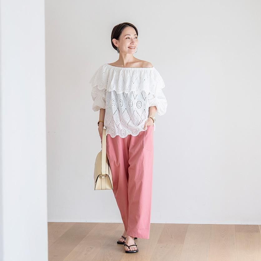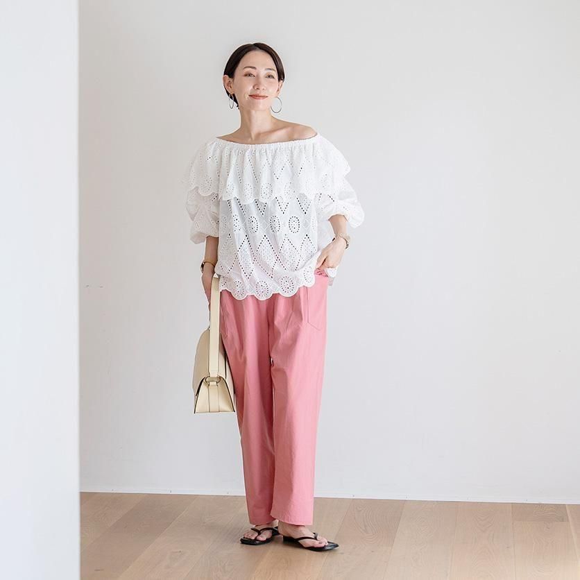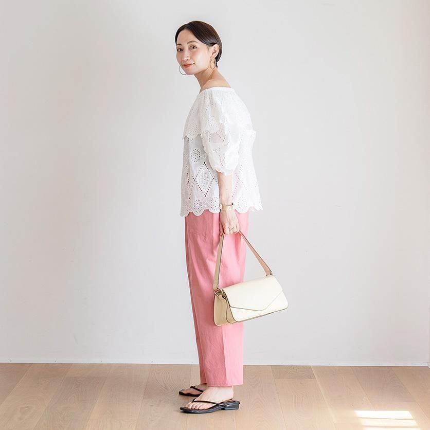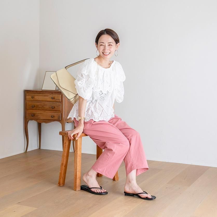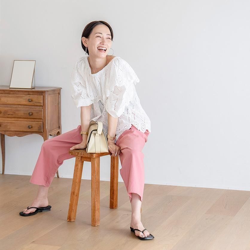 ゆったり幅で体型を選ばないのが嬉しいポイント◎かつ、もっさりして見えないのはクロップド丈ならではですね!